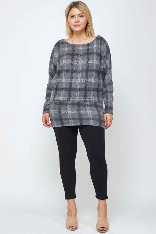 Plus Size Boat Neck, Plaid Print Tunic Top, With Long Dolman Sleeves – Stylish & Comfortable