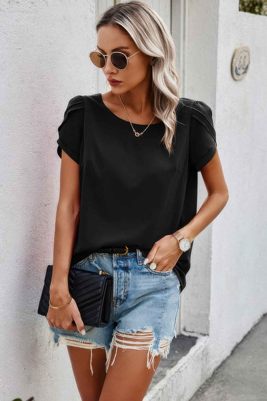Round Neck Soild Loose Fit Puff Sleeves Blouse