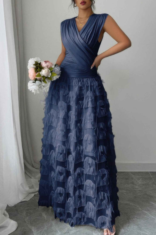 Solid V Neck Ruched Texture Splice Sleeveless Dress
