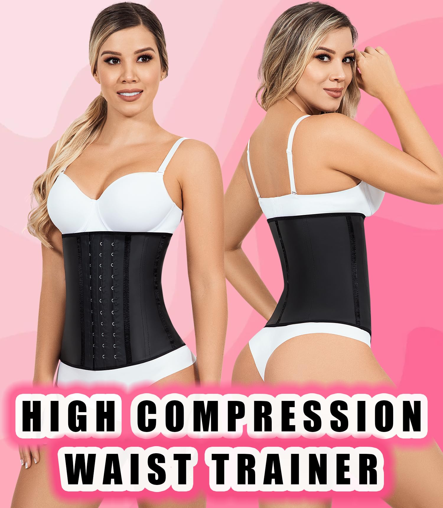 - PREMIUM QUALITY: Premium latex waist trainer corset for women — made in Colombia for superior quality and durability. Features flexible steel boning for posture correction and to prevent rolling or bunching. The 3 rows of hook-and-eye closures let you adjust compression for progressive waist slimming. Ideal for waist training, tummy control, and postpartum recovery.