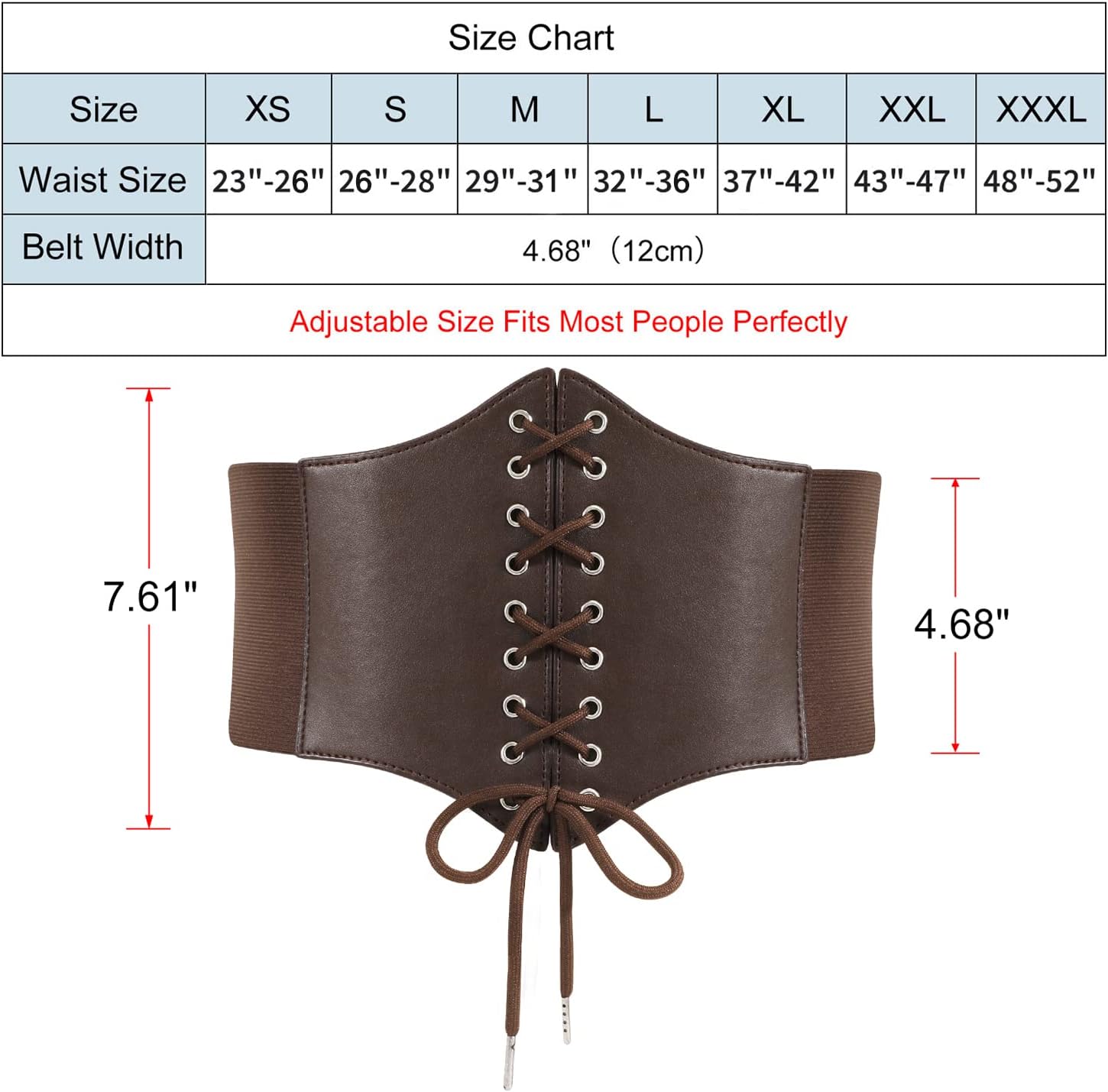 - 🎃Perfect Size—This waspie corset belt with high elastic, 6 sizes available, fits most women perfectly. The lace-up cinch belts front PU leather’s width is 7.61”, elastic band’s width is 4.68”. Enough width can perfectly around the waist, shaping your hourglass figure, better highlight your charm.