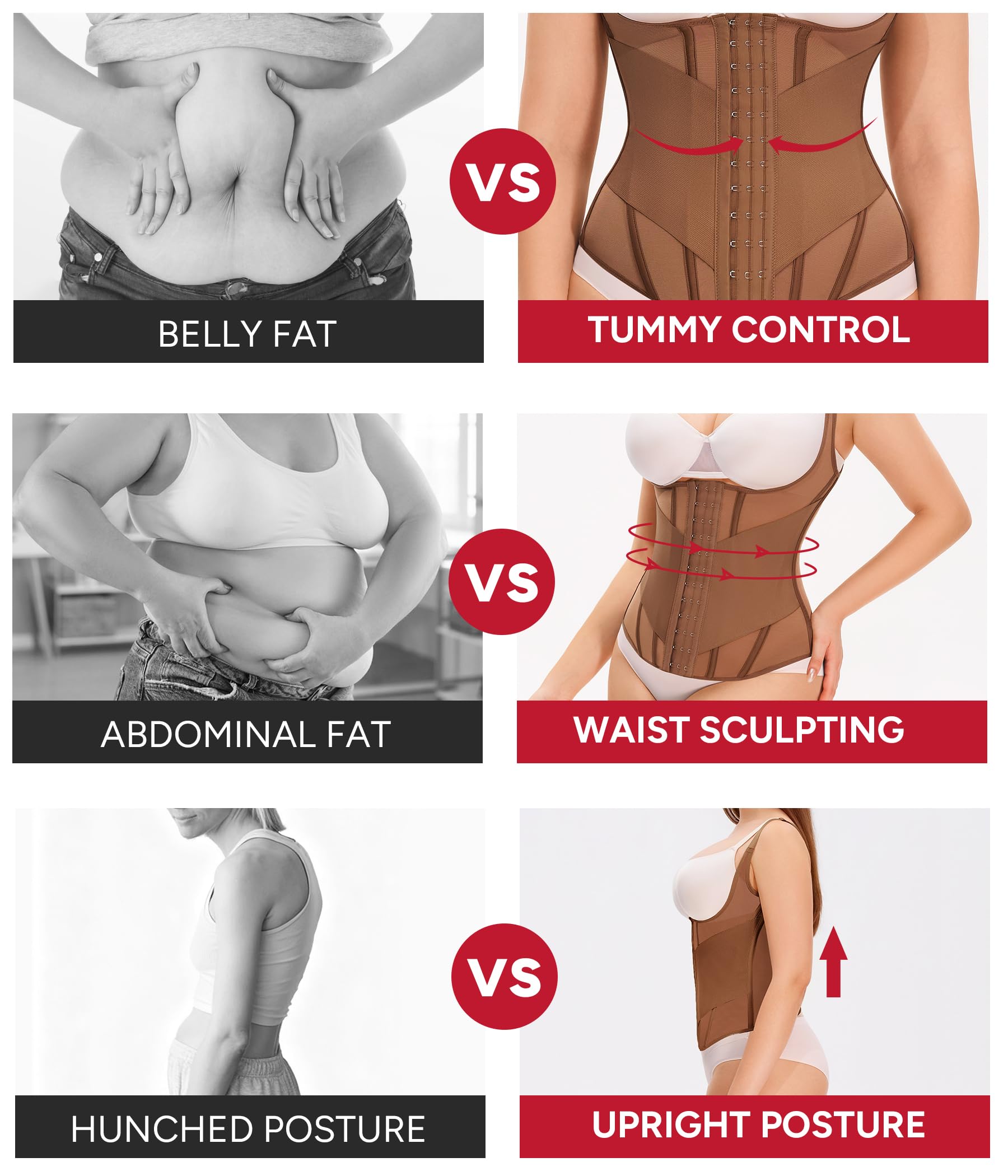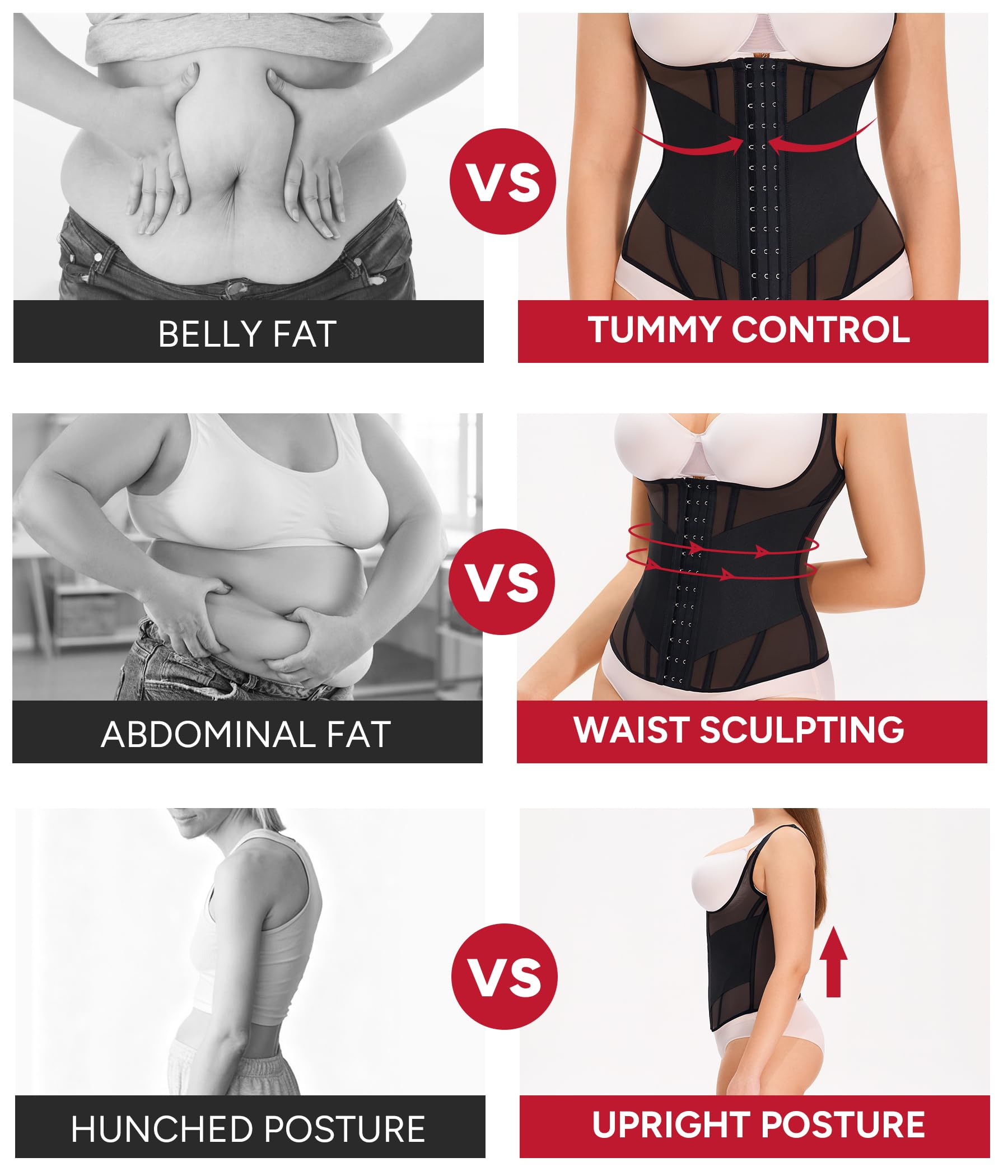 - Waist Trainer for Women Belly Fat: This tummy control shapewear features 3 rows of adjustable hook-and-eye closures combined with front-side elastic bands for double compression. The corset shapewear tummy control flatten the abdomen, reduce the waistline, and smooth out bulges, it instantly shapes a sleek hourglass silhouette. Offering adjustable compression for a customized fit, this waist cincher supports your body shaping journey.