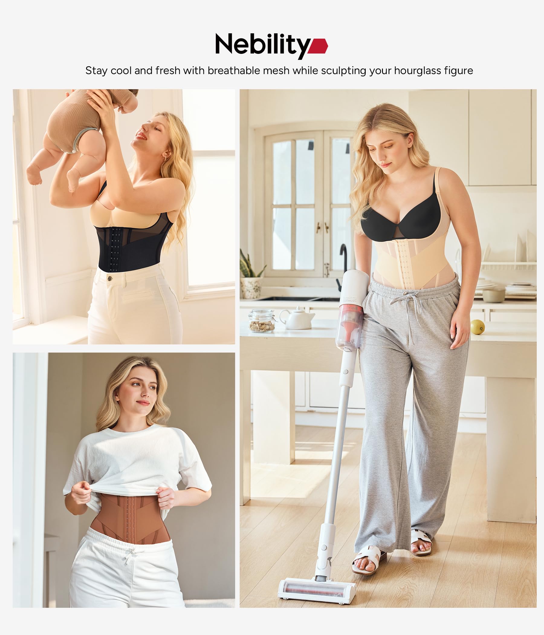 - U-Shaped Waist Corset with Adjustable Straps: Nebility stomach shapewear features wide adjustable straps that ease shoulder pressure while allowing you to customize the length to fit your torso. The gentle U-shaped neckline softly lifts the bust for a fuller look and stays comfortably in place, while its seamless body shaper design smooths underarm bulges and remains invisible under clothing for a streamlined, confident silhouette.