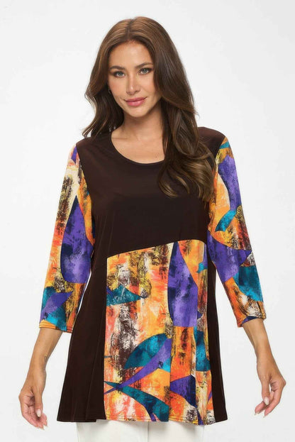 Clean lines and subtle contrast give this knit top a polished, modern edge. The round neckline and quarter sleeves offer timeless appeal, while the curved color-blocking adds shape and visual interest. Crafted from soft ITY fabric with flexible stretch, it's an easy piece to dress up or down. Made in the USA for lasting quality.