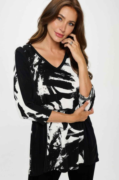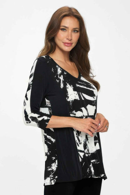 This BNS contrast top pairs a vibrant print with structured binding at the neckline for a refined yet lively look. The V-neck cut enhances the silhouette, while the soft, stretch fabric ensures a comfortable fit. With its mix of color, contrast, and polish, this quarter sleeve top transitions effortlessly from day to night. Made in the USA.