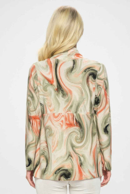 Layer up in style with this mid-cut print jacket, designed with an open front and draped silhouette for an effortlessly polished look. The neutral-toned print pairs beautifully with solid or coordinating tanks, offering a versatile option for work or weekend wear. Crafted with a touch of stretch, it moves with you for all-day comfort. A lightweight layer that adds refinement without the bulk.