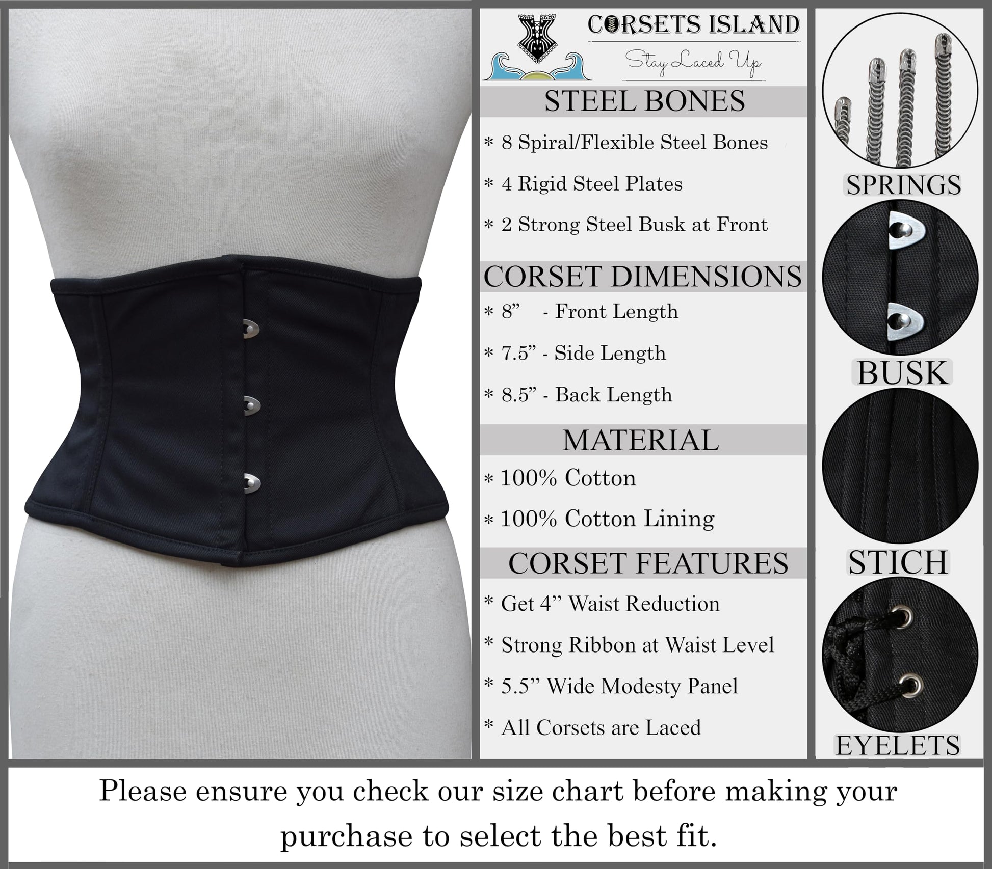 Corset Measurements: With a front length of 9.5 inches, side length of 7.7 inches, and back length of 9 inches, our corset is designed to flatter your figure. It features a 5-inch modesty panel at the back and strong ribbon ties at waist level for added comfort.