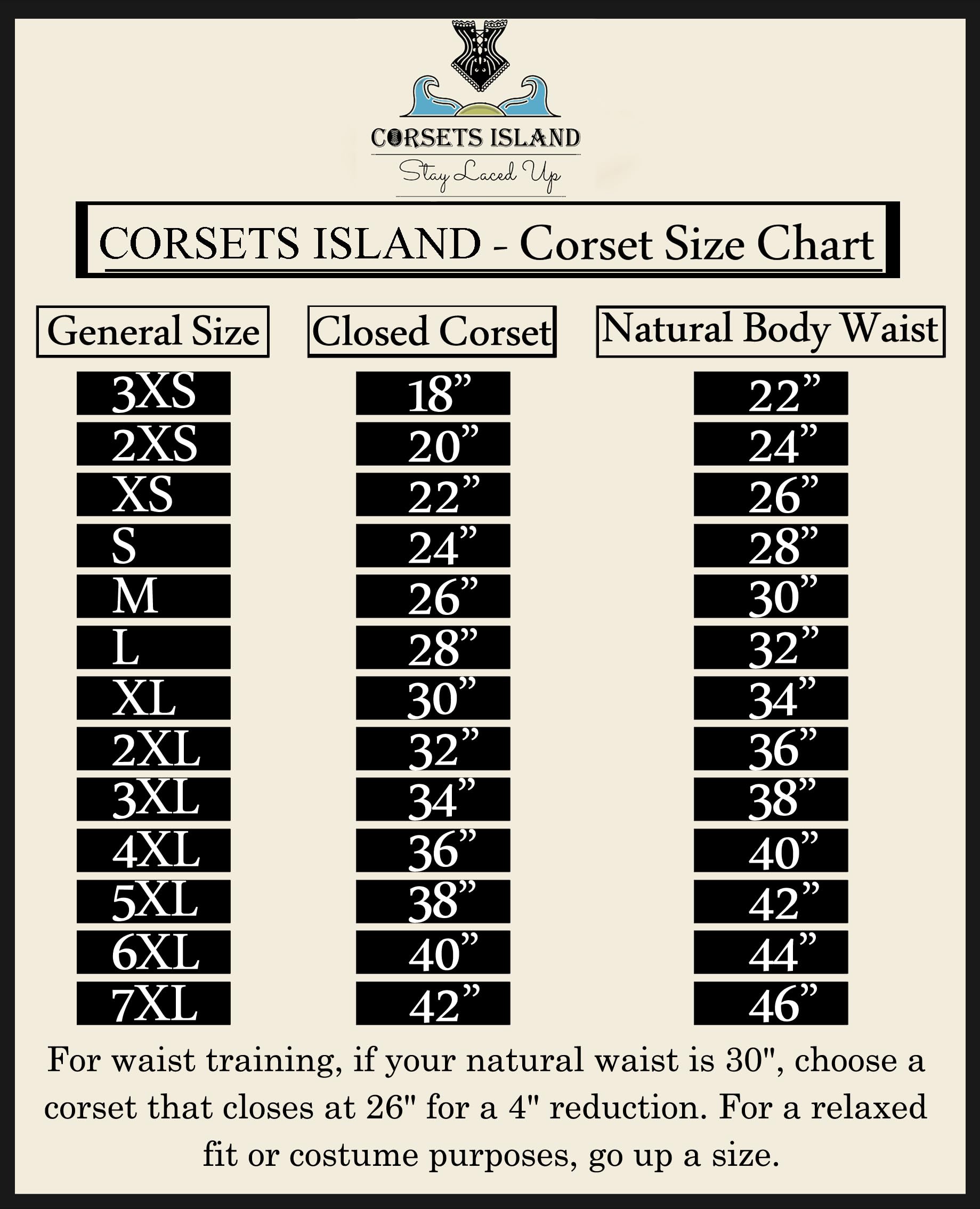 - Size Guide: Buying for waist training? If your natural waist is, for example, 30", opt for a Medium size corset that closes at 26". This provides a 4" reduction capability. If you're purchasing for costume completion or seeking a comfortable fit without waist training intentions, consider going up a size for a relaxed fit. Refer to our Size Chart for selecting your ideal size :)